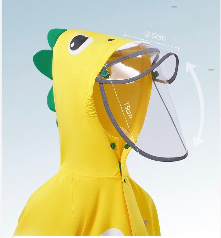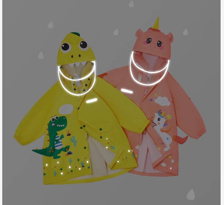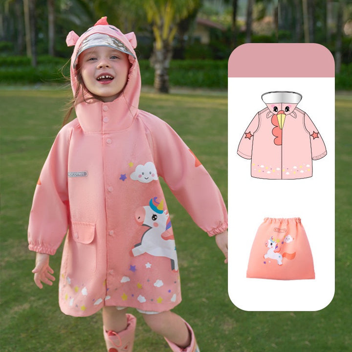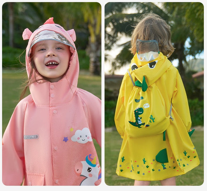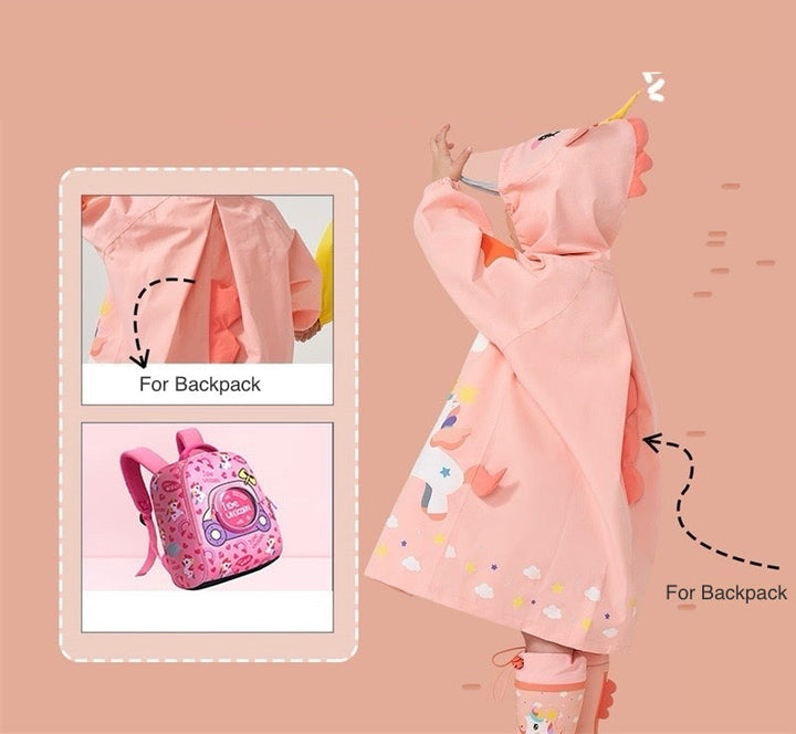 The 3D Cartoon Toddler Raincoat has a hidden schoolbag pocket located on the back. It easily stores a schoolbag, and it also comes with a convenient carrying storage bag.